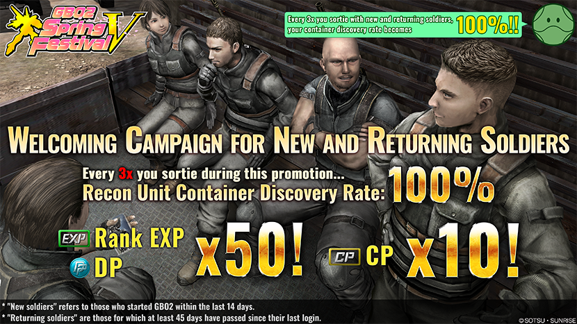 During the campaign, Rank EXP and DP will go up to 50x, CP will also be boosted 10x!!- Additionally, every 3 sorties will grant you 100% recon team discovery chance increases!