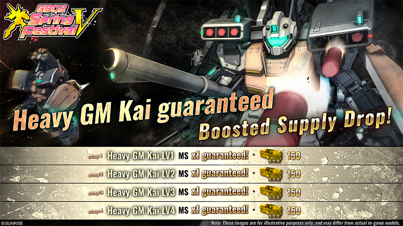 - ・STEP1 (30 tokens): Heavy GM Kai LV1 x1 guaranteed! + 150 ★★★ Modification kits for bonus!