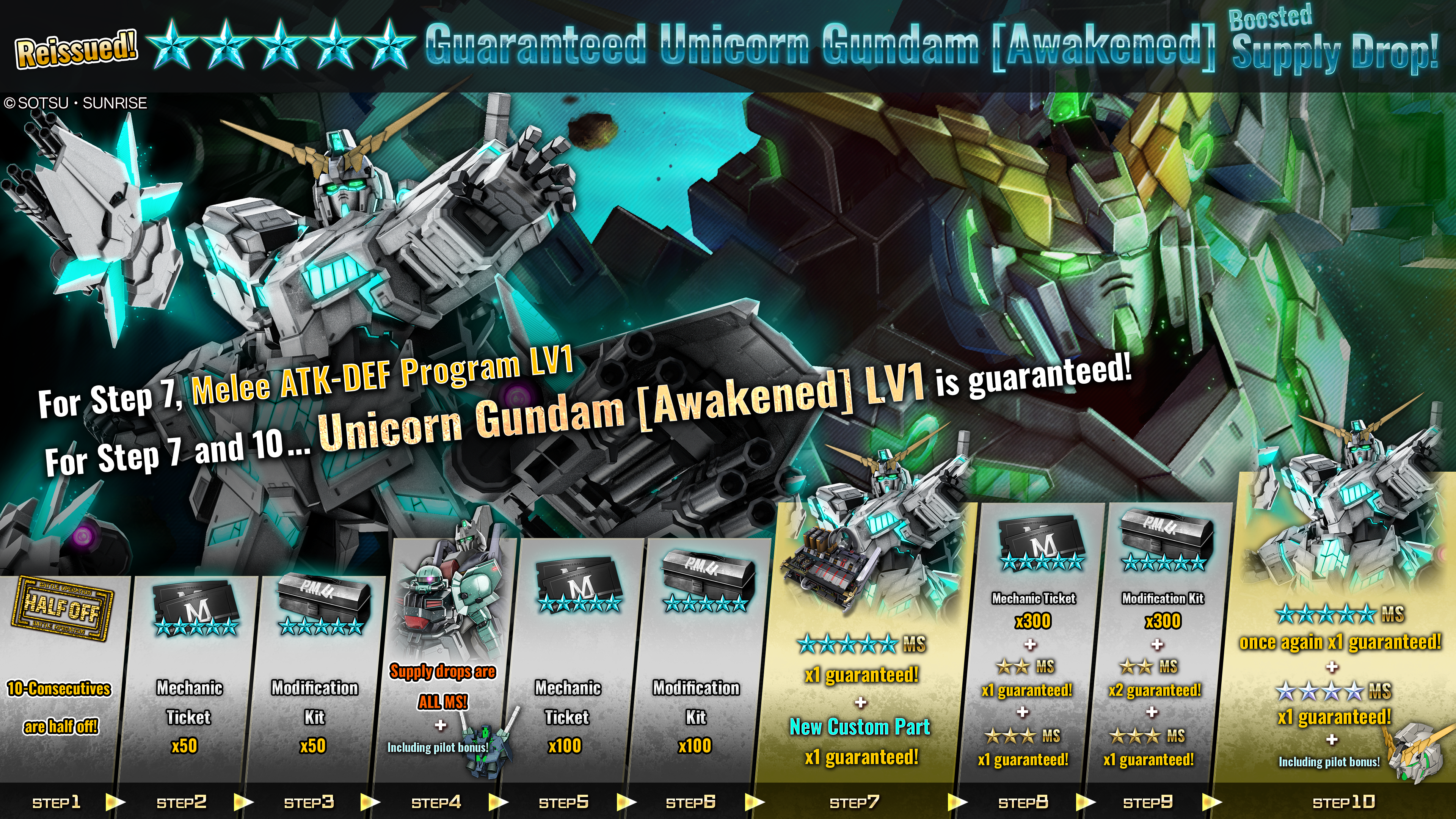 - ■[Revival event] Unicorn Gundam [Awakened] guaranteed STEP UP Supply Drop