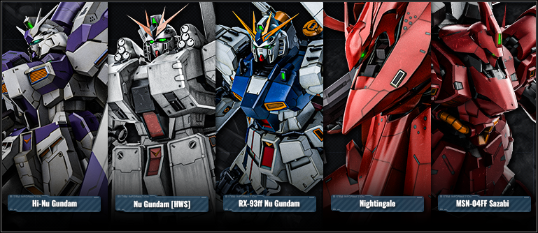 ・★★★★ Hi-Nu Gundam LV2 (General unit, ground/space uses, cost: 750) ・★★★★ Nu Gundam [HWS] LV2 (Support unit, ground/space uses, cost: 750) ・★★★★ RX-93ff Nu Gundam LV2 (Raid unit, ground/space uses, cost: 750) ・★★★★ Nightingale LV2 (Raid unit, ground/space uses, cost: 750) ・★★★★ MSN-04FF Sazabi LV2 (Support unit, ground/space uses, cost: 750) -