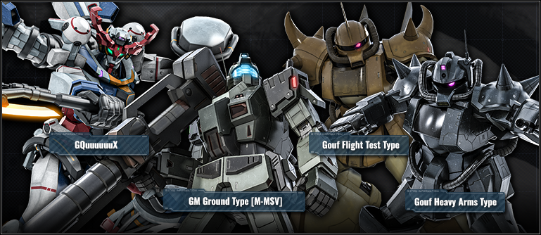 ・★★★ GQuuuuuuX LV2 (General unit, ground/space uses, cost: 550) ・★★–★ Gouf Heavy Arms Type LV3 – 4 (General unit, ground only, cost: 400-) ・★★–★ Gouf Flight Test Type LV3 – 4 (General unit, ground only, cost: 450-) ・★ GM Ground Type [M-MSV] LV4 (Raid unit, ground only, cost: 400) -