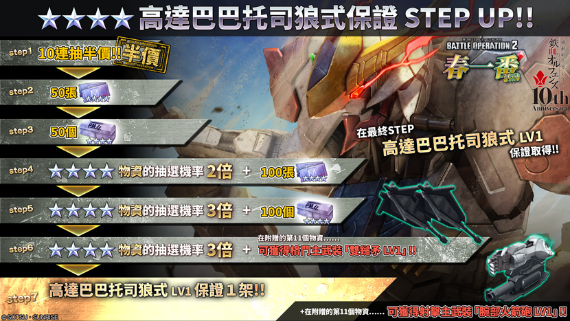 以及可取得與高達巴巴托司狼式相性絕佳的改裝零件得STEP UP抽選配給。 - ◎高達巴巴托司狼式保證STEP UP抽選配給
