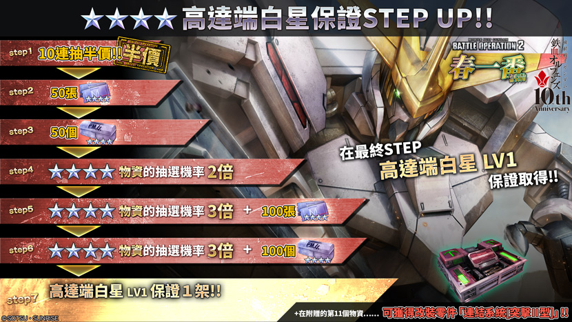 - ・STEP7(代幣30枚):「高達端白星 LV1」保證1架!!