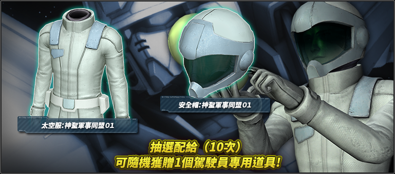 - ※期間內只要進行抽選配給(10次)就會自動進行第11次的抽選配給,就可隨機獲得駕駛員專用道具1個。