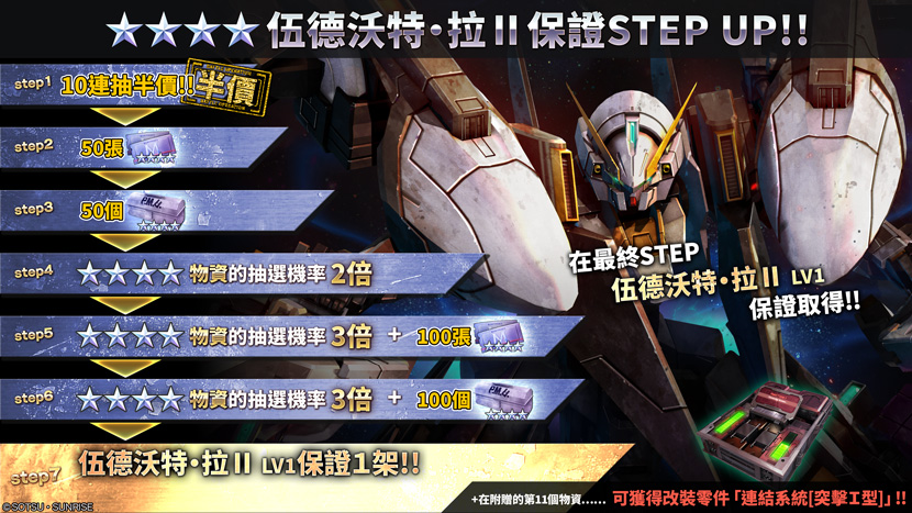- ・STEP6(代幣30枚):★★★★物資的抽選機率3倍!+ 保證獲得改裝套件[★★★★]100個!