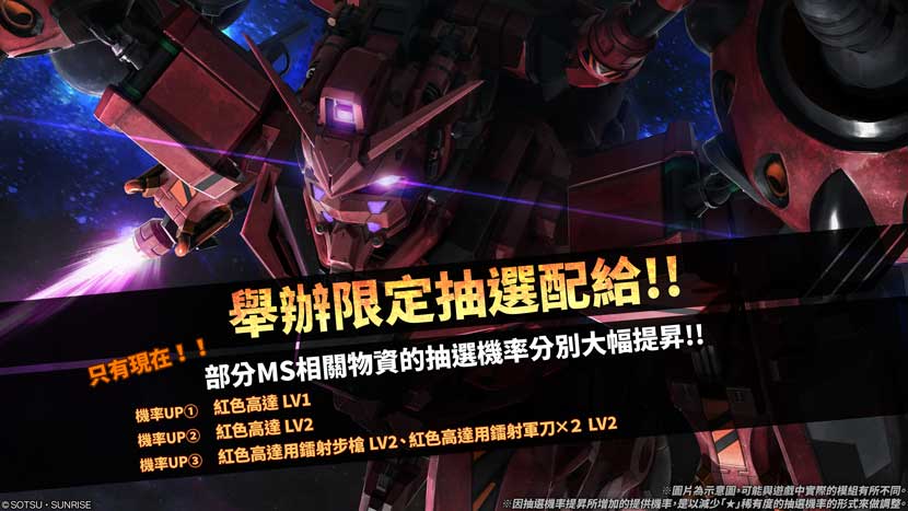 - 限定抽選配給將會針對目標機體各LV,主武裝等提高各自的抽選機率。