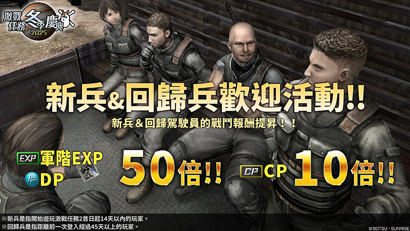 - ※自2025年12月4日(週四)14:00<JST>預定的更新後往回推算第一次開始遊玩激戰任務2之後14天以內的駕駛員為新兵,45天以上未登入的駕駛員為回歸兵。