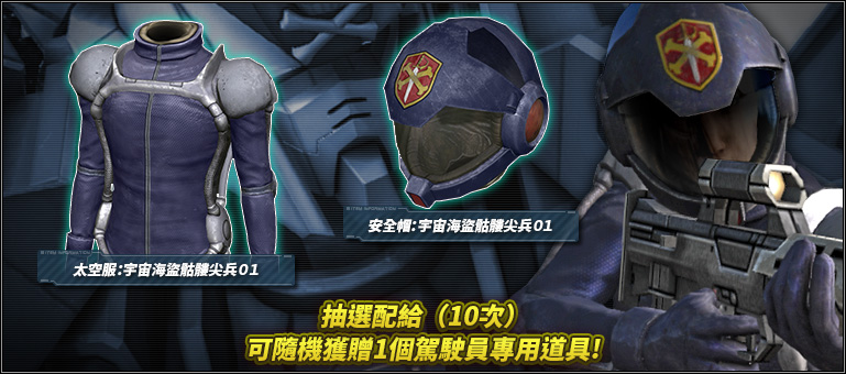 - ※期間內只要進行抽選配給(10次)就會自動進行第11次的抽選配給,就可隨機獲得駕駛員專用道具1個。