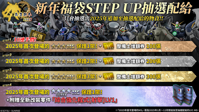 - 2026年1月1日(週四)起,舉辦各STEP可獲得新MS「太空坦克R-44」LV1~4的STEP UP抽選配給。