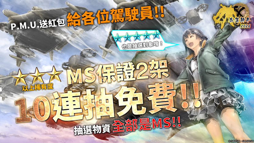 - 活動期間內,★★★以上MS保證2架的免費抽選配給(10連),將可在第1週及第2週各進行1次 ,總計可進行2次的免費抽選配給。