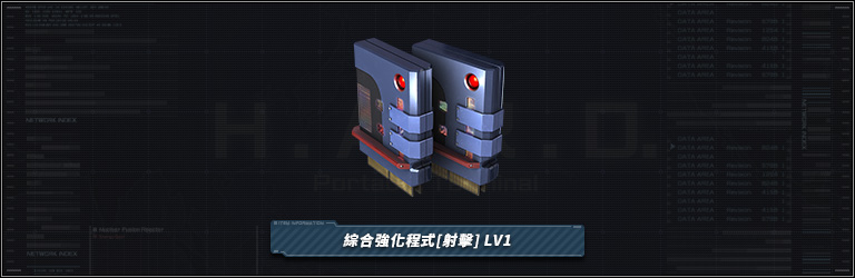 綜合強化程式[射擊] LV1 機體HP增加100、耐實彈修正值、耐鐳射修正值、射擊修正值增加1