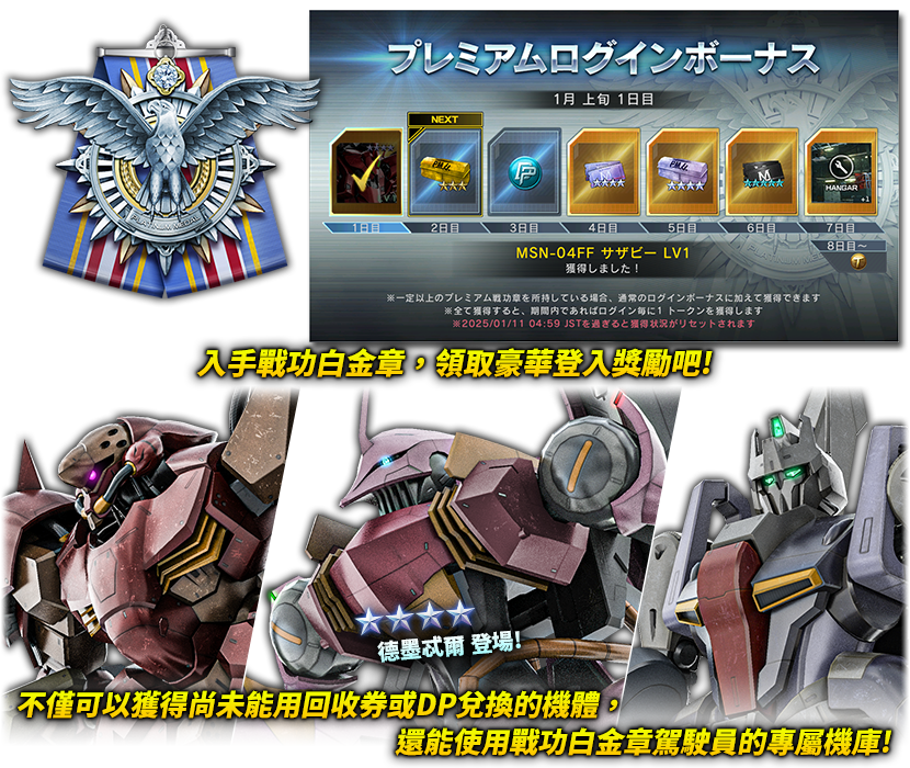 - ※獲領「戰功白金章」的隔天5:00AM<JST>之後,才能獲得豪華登入獎勵。