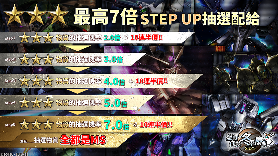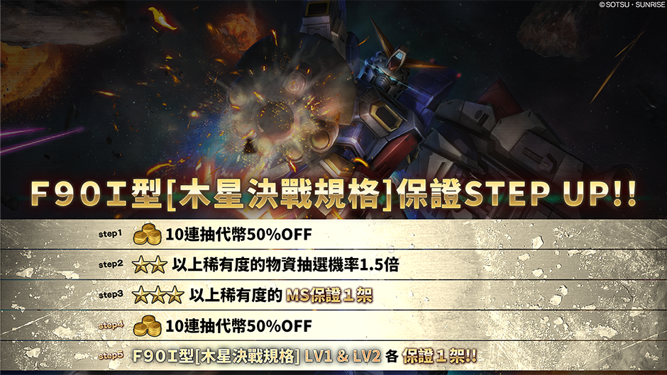 - ・STEP3(30枚代幣):更加精選的4架強力機體中保證抽到1架!!且「卓越積根 LV1」保證1架!