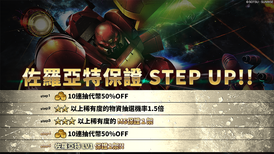 - ・STEP3(30枚代幣):更加精選的4架強力機體中保證抽到1架!!且「卓越積根 LV1」保證1架!
