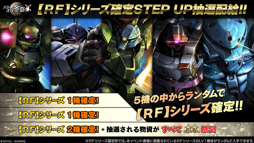 ・STEP3(トークン30枚):5機の【RF】シリーズからランダムで2機確定!+抽選物資がすべて★★以上レアリティMS! -