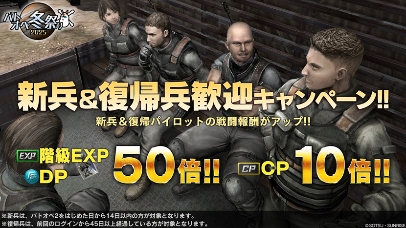 - 期間中、バトオペ2をはじめた日から14日以内の新兵&バトオペ2に45日以上ログインしていなかった復帰兵は、