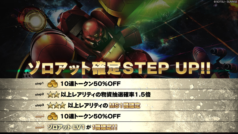 - ・STEP3(トークン30枚):★★★以上レアリティのMSが1機確定!