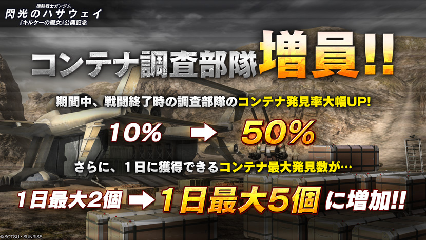- 期間中、戦闘終了後のコンテナ発見率が通常「10%」のところ、「50%」にアップ!