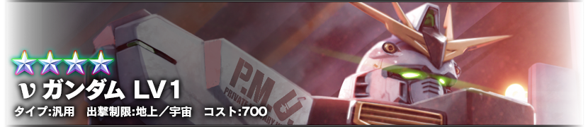 - ログイン6日目:νガンダム LV1 (汎用、地上/宇宙両用、コスト700)