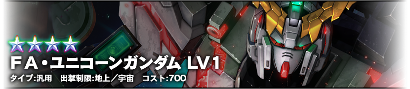 - ログイン7日目:FA・ユニコーンガンダム LV1 (汎用、地上/宇宙両用、コスト700)