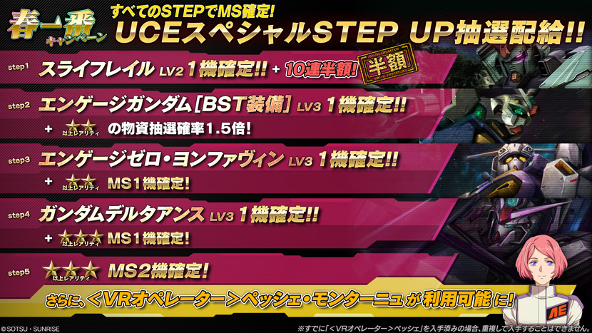- 期間中、MSやカスタムパーツ等が入手できる特別なSTEP UP抽選配給を開催いたします。