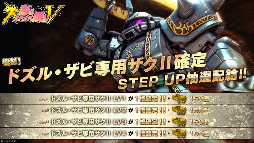 - ・STEP4(トークン30枚):ドズル・ザビ専用ザクⅡ LV4 が1機確定!+おまけで改修キット[★★★]150個付き!