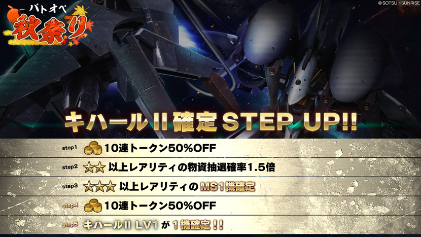 - ・STEP3(トークン30枚):★★★以上レアリティのMSが1機確定!