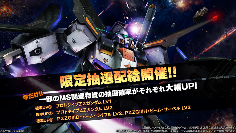 限定抽選配給では、「プロトタイプZZガンダム」関連の抽選確率がアップしております。 - ■抽選確率アップの対象物資