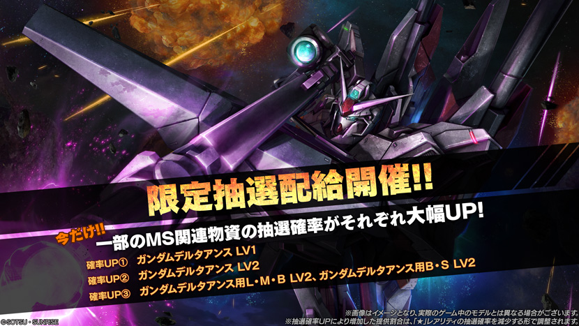 限定抽選配給では、「ガンダムデルタアンス」関連の抽選確率がアップしております。 - ■抽選確率アップの対象物資