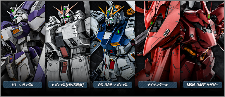 ・★★★★ Hi-νガンダム LV2 (汎用、地上/宇宙両用、コスト750) ・★★★★ νガンダム[HWS装備] LV2 (支援、地上/宇宙両用、コスト750) ・★★★★ RX-93ff νガンダム LV2 (強襲、地上/宇宙両用、コスト750) ・★★★★ ナイチンゲール LV2 (強襲、地上/宇宙両用、コスト750) ・★★★★ MSN-04FF サザビー LV2 (支援、地上/宇宙両用、コスト750) -