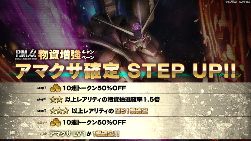 - ・STEP3(トークン30枚):★★★以上レアリティのMSが1機確定!