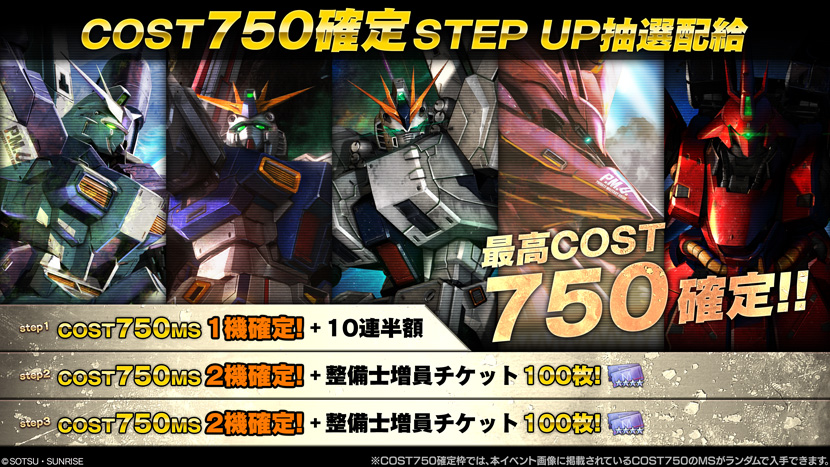 - ・STEP3(トークン30枚):COST 750 MSが2機確定!+おまけで整備士増員チケット[★★★★]100枚!