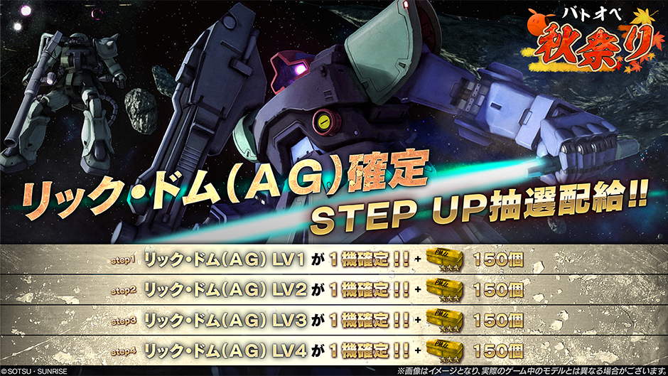 - ・STEP1(トークン30枚):リック・ドム(AG)LV1が1機確定!+おまけで改修キット[★★★]150個もらえる!