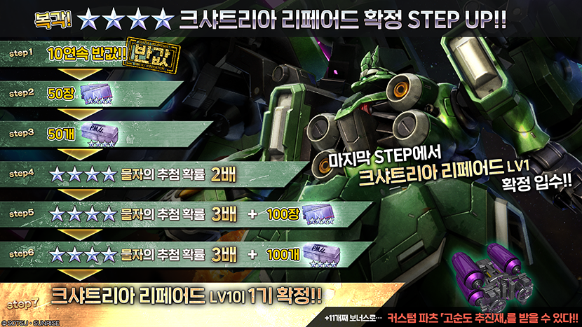 - ・STEP6(토큰 30개): ★★★★ 추첨 확률이 3배!+보너스로 개량 키트[★★★★] 100개를 받을 수 있다!