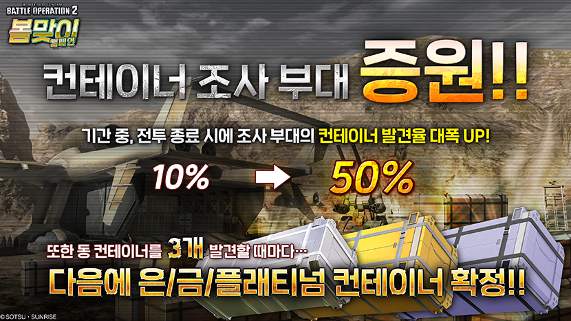 - 기간 중에 전투 종료 후의 컨테이너 발견율이 평상시의 「10%」에서 「50%」로 UP!