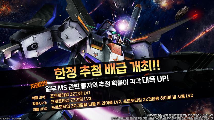 한정 추첨 배급에서는 「프로토타입 ZZ건담」 관련 물자에 추첨 확률 업이 적용됩니다. - ■추첨 확률 업 대상 물자