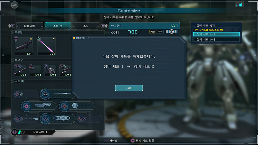 우선 커스텀 파츠와 쇼트 컷을 「장비 세트 1」에 설정합니다. -