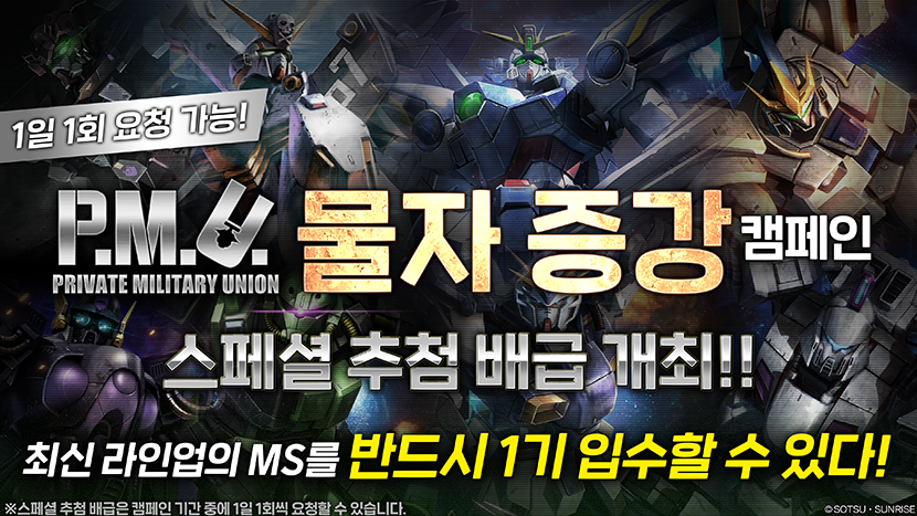 - 기간 중에 최신 라인업의 MS가 1기 확정인 스페셜 추첨 배급(1회/토큰 3개)을 매일 1회씩 요청할 수 있습니다.