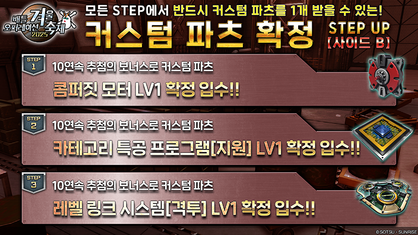 ・STEP3(토큰 30개): 10연속 추첨의 보너스로 커스텀 파츠 「레벨 링크 시스템[격투] LV1」이 확정!