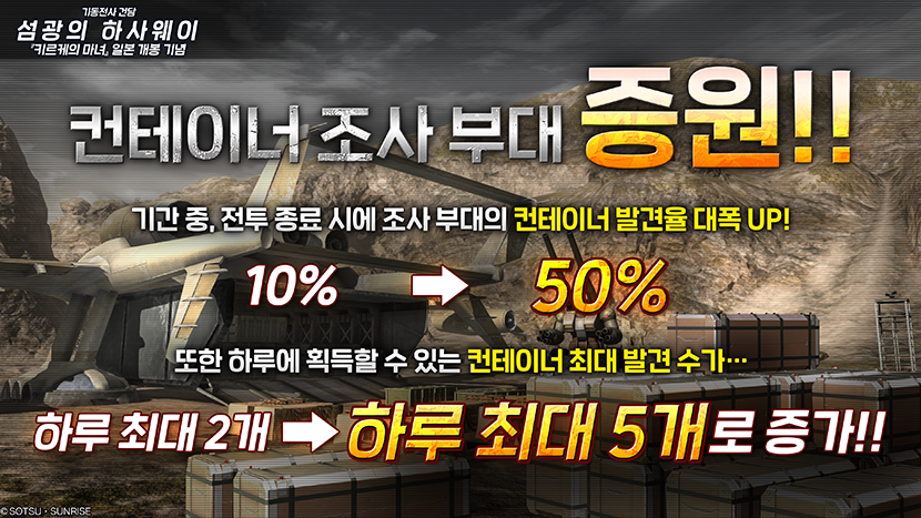 - 기간 중에 전투 종료 후의 컨테이너 발견율이 평상시의 「10%」에서 「50%」로 UP!