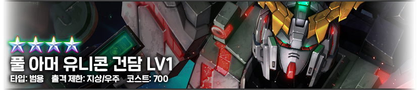 - 로그인 7일째: 풀 아머 유니콘 건담 LV1 (범용, 지상/우주 양용, 코스트 700)