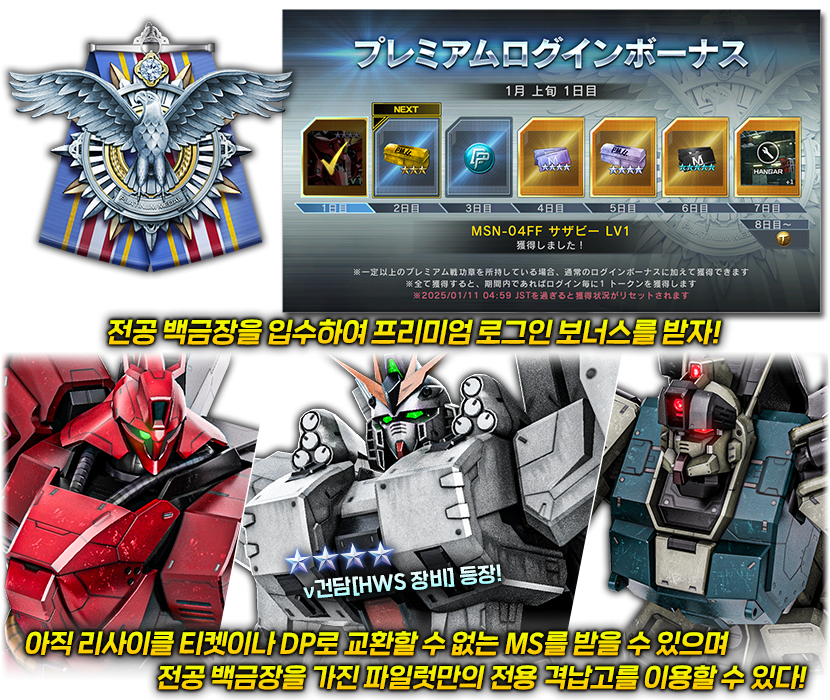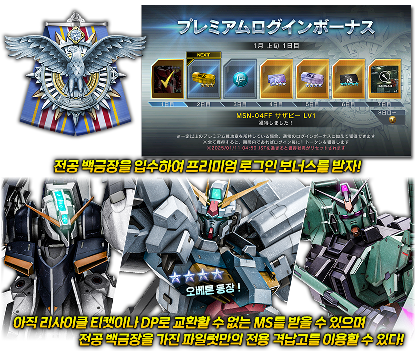프리미엄 로그인 보너스는 『전공 백금장』을 수여받은 파일럿만 수령할 수 있습니다. -