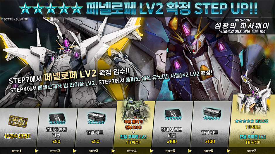 - ・STEP7 (30토큰):페넬로페 LV2이 1기 확정! +11번째에 콤퍼짓 웨폰 유닛[빔 사벨]×2 LV2를 확정 입수!