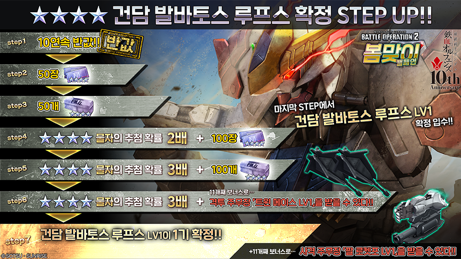 - ・STEP6 (30토큰):11번째에 보너스로 개량 키트[★★★★★] 100개를 입수!