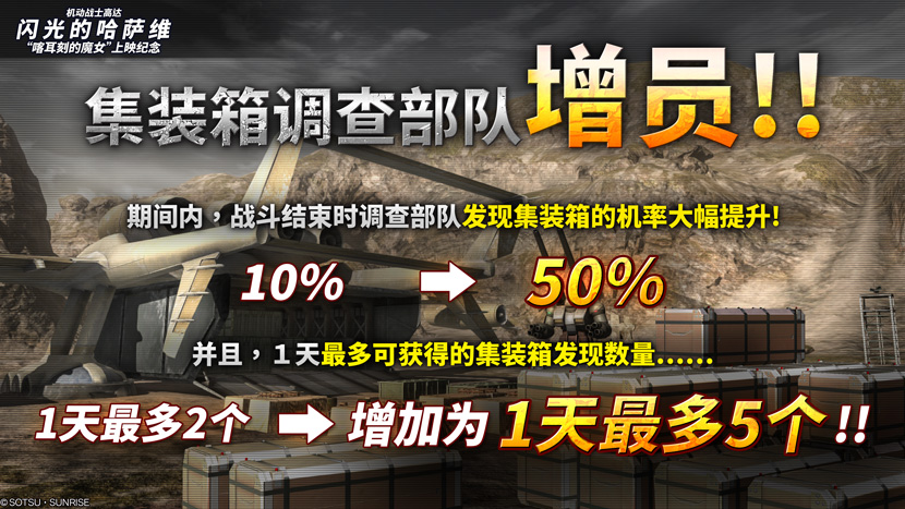 - 活动期间内,平时战斗结束后的集装箱发现率为「10%」,此次则增为「50%」!