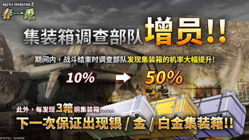 - 活动期间内,平时战斗结束后的集装箱发现率为「10%」,此次则增为「50%」!