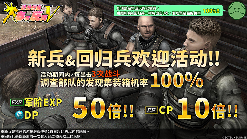 即使是经常游玩的驾驶员,只要跟新兵&回归兵一起出击 ,每出击3次,调查部队的集装箱发现率也将增为100%! - 活动详情,请参阅这里。