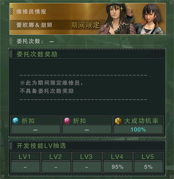 ⇒ 蕾欧娜&甜妲为 「大成功机率100%」及「开发技能LV必定达4以上」的特殊维修员。