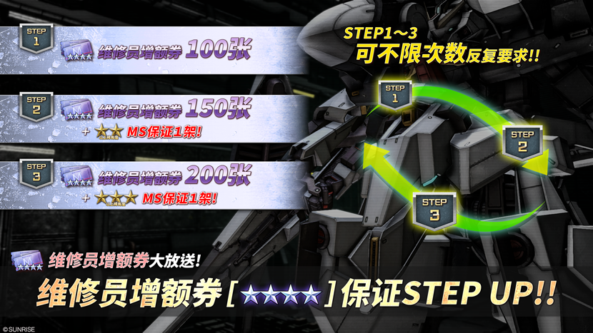 - ・STEP3(代币30枚):特赠维修员增额券[★★★★] 200张!+★★★以上MS保证1架!