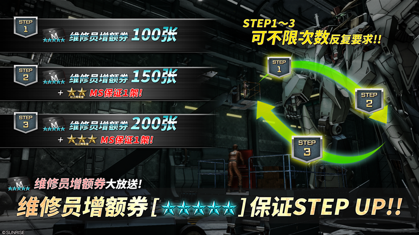 - ・STEP3(代币30枚):特赠维修员增额券[★★★★★] 200张!+★★★以上MS保证1架!